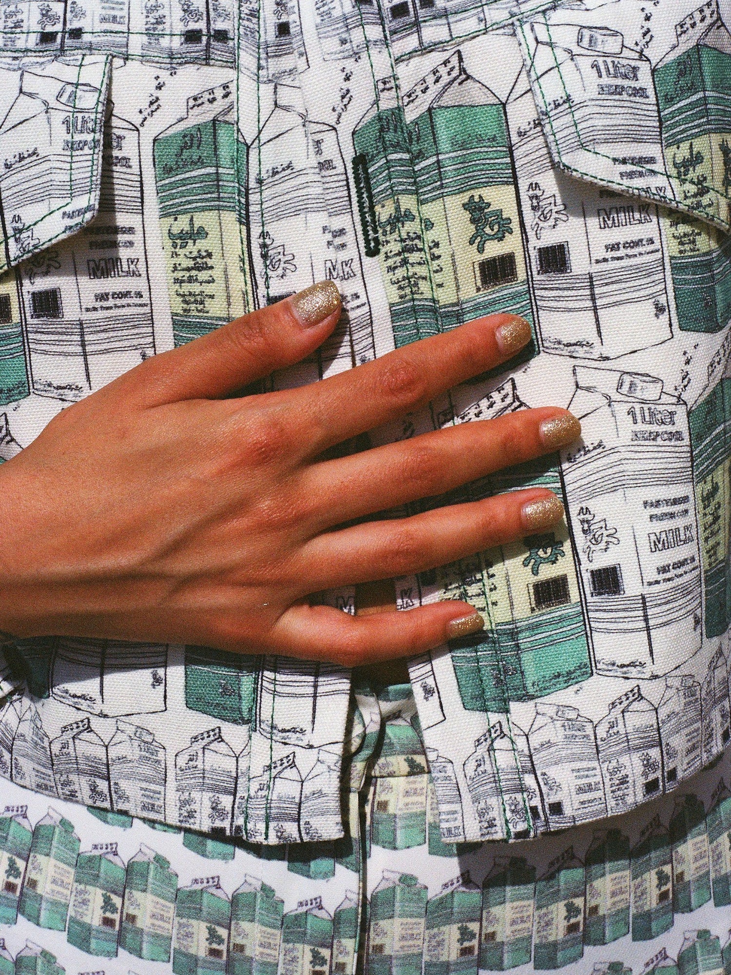 هذا الجاكيت القصير مميز و مناسب لدولابك الصيفي. طباعة الحليب موزعة على جميع أجزاء الجاكيت
