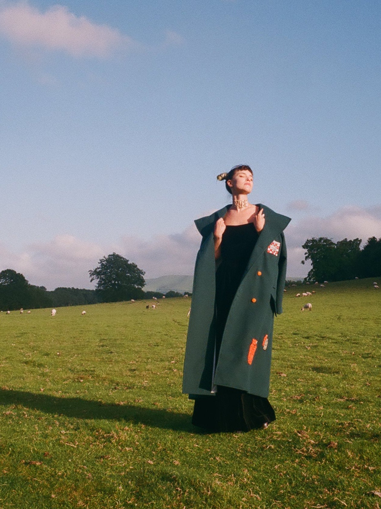 Embroidered long oversized coat with the cars design scattered all over done by the traditionally skilled tailors in Amman.
